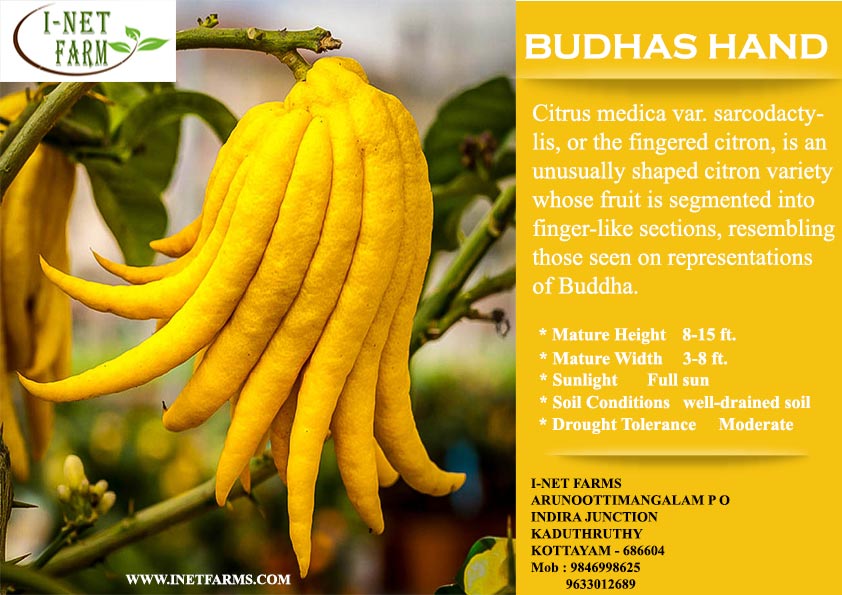 Citrus medica var. sarcodactylis, or the fingered citron, is an unusually shaped citron variety whose fruit is segmented into finger-like sections, resembling those seen on representations of Buddha. It is called Buddha's hand. The different cultivars and variations of this citron variety form a gradient from "open-hand" types with outward-splayed segments to "closed-hand" types, in which the fingers are kept together. There are also half-fingered fruits, in which the basal side is united and the apical side fingered.